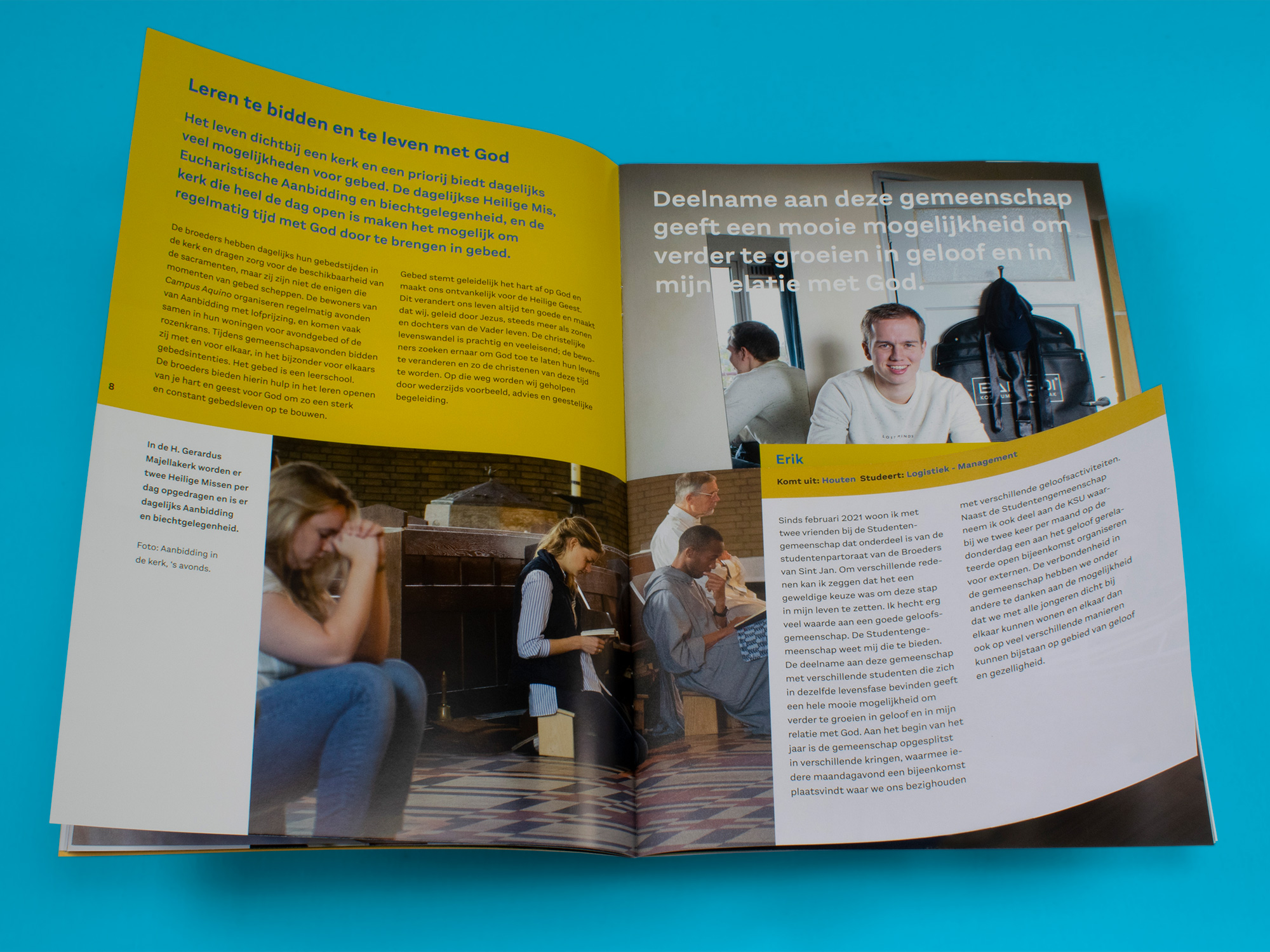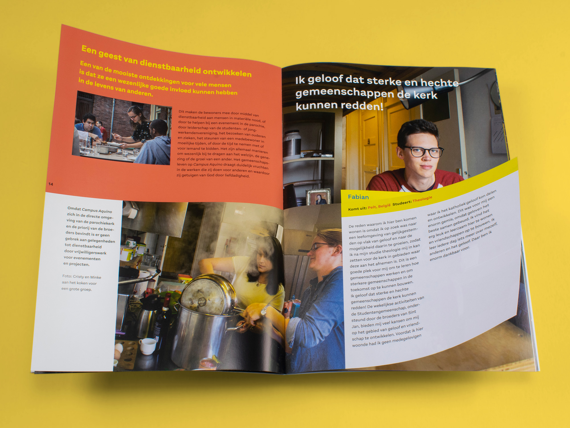 Campaign concept and design for Campus Aquino: a residential community in Utrecht for Catholic students and young professionals, where they can grow in faith, education, study and work. The aim of the campaign is to raise fundings to be able to purchase real estate for the community. Developing of a campaign concept and editorial formula, translated into images, typography and color.